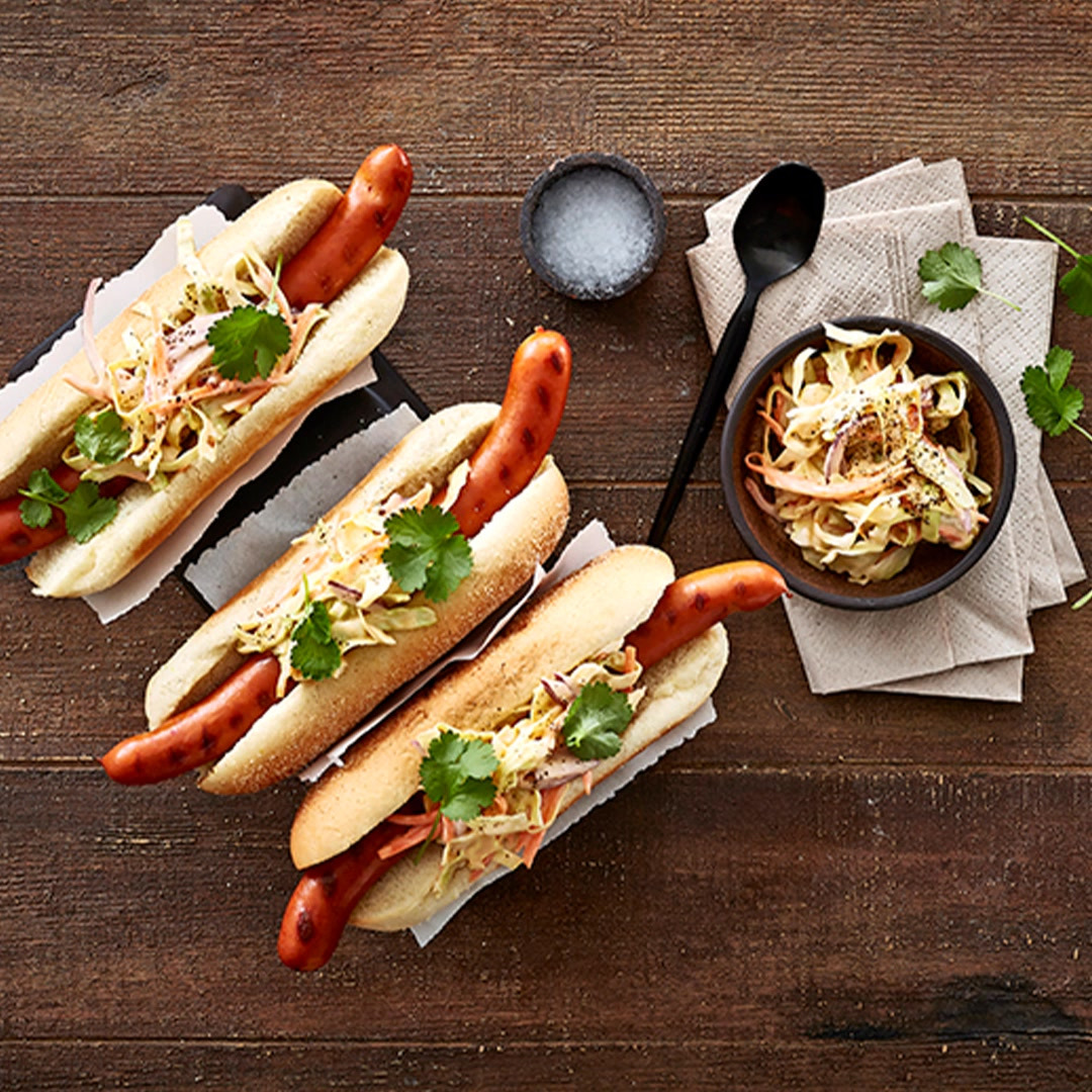 Hotdogs med pikant og sprød coleslaw