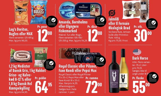 Købmand Morten deler nogle af de attraktive tilbud: "Du kan vælge mellem lækre Lay's, Doritos, Bugles eller Max til kun 12 kr., eller du kan fylde lagret op med kvalitetsfisk fra Amanda, Bornholms eller Glyngøre - hver dåse for blot 12 kr. Derudover tilbyder vi Royal Classic eller Pilsner, kun 72 kr. pr. ramme, og den populære Dark Horse hvid- eller rødvin for 55 kr. flasken," oplyser Morten.