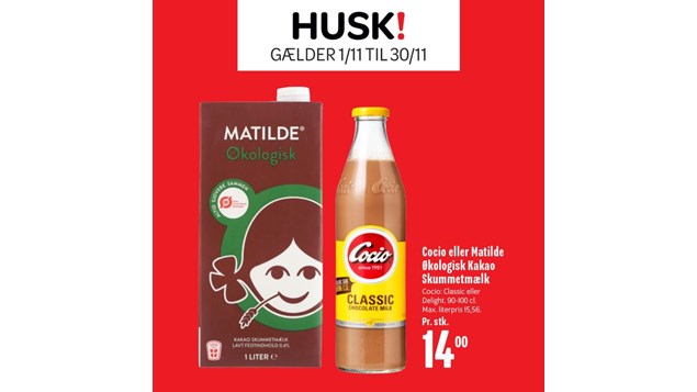 Min Købmand i Nim tilbyder hele november en flaske Cocio eller Matilde Økologisk kakao skummetmælk til 14 kr. For mere information, læs det oprindelige opslag.